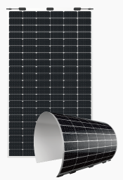 フレキシブル型も種類が増えていました。重さは㎡/2.9㎏と軽く、いろんな場所に設置が可能ですが、「薄くて軽い」ので、施工時の下地処理などには神経を使います。一般型太陽光パネルと違い、架台固定のボルト止めなどがなく、のり付けが基本。メーカーさんは「下地処理を怠ると飛んで行っちゃいますよ」と言っていました。